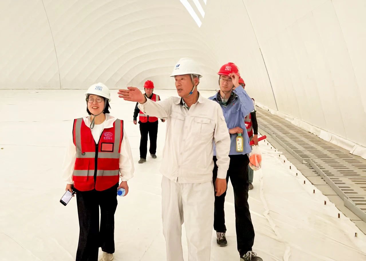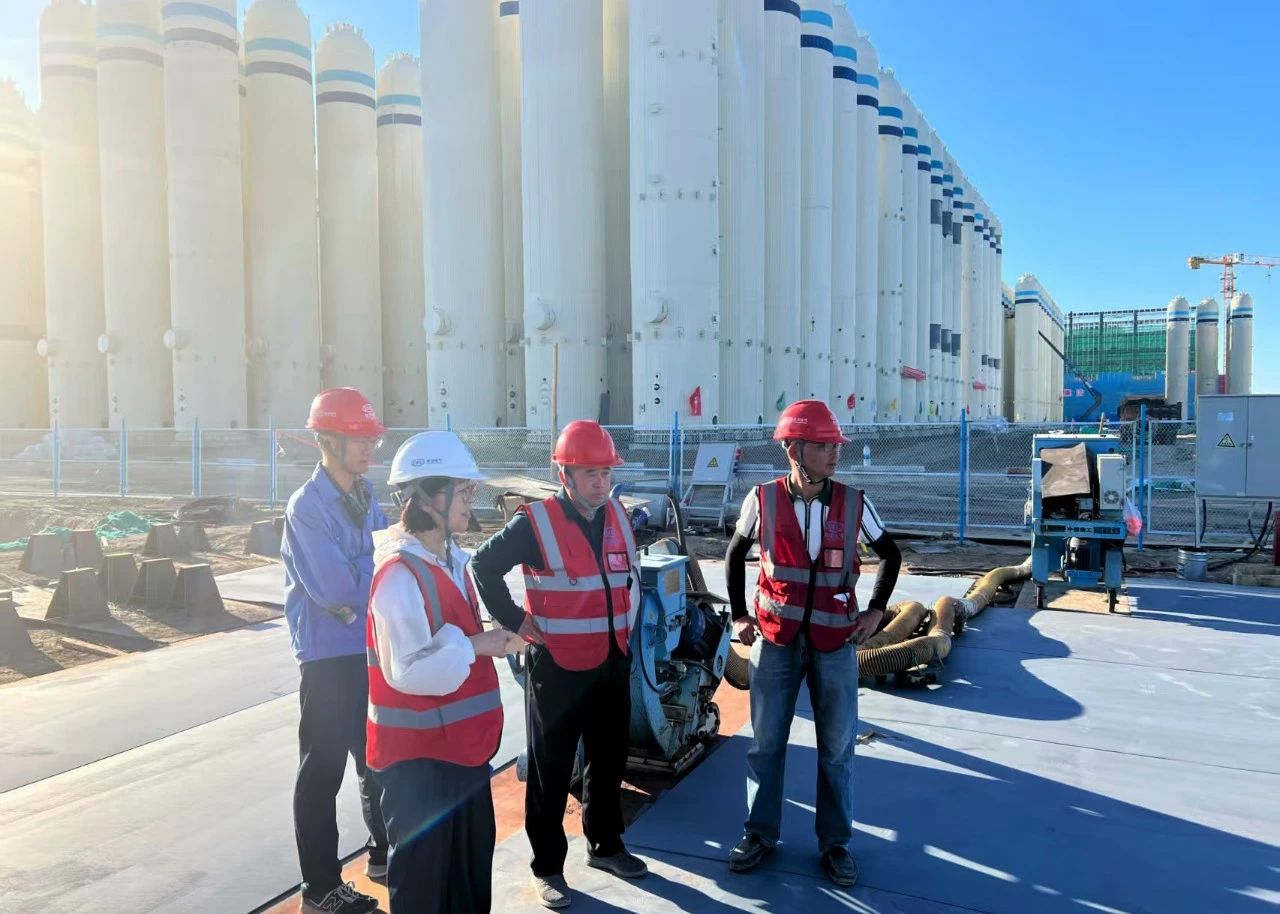 隨后,劉月琴總工一行在業(yè)主的帶領(lǐng)下深入主發(fā)電機(jī)房和氣包內(nèi)部了解系統(tǒng)工作原理和關(guān)鍵技術(shù),儲(chǔ)存低壓二氧化碳的巨型膠囊狀氣包、高聳林立的高壓液態(tài)二氧化碳儲(chǔ)能罐以及四周密布的光伏發(fā)電板,現(xiàn)場(chǎng)震撼力十足,切實(shí)感受到祖國(guó)新能源發(fā)展的宏圖偉業(yè)。劉月琴由衷感慨:“公司能夠參與建設(shè)全球最大二氧化碳儲(chǔ)能發(fā)電項(xiàng)目,作為其中一員深感自豪?!彼俅味陧?xiàng)目部同事務(wù)必嚴(yán)要求、高質(zhì)量完成這項(xiàng)偉大任務(wù)。