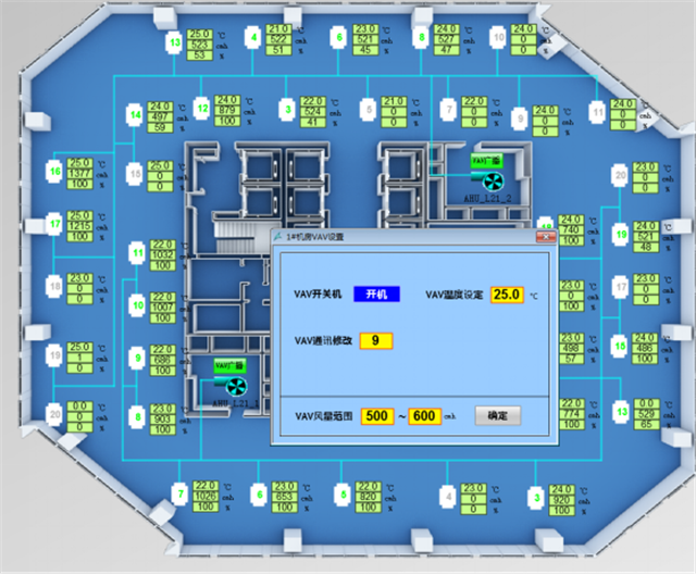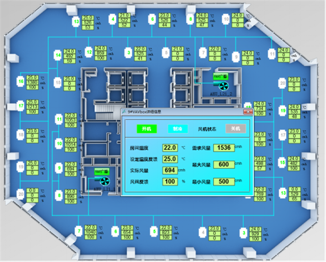 建筑設(shè)備監(jiān)控系統(tǒng)服務(wù)器、工作站設(shè)于地下一層建筑設(shè)備管理中心,負(fù)責(zé)空調(diào)與通風(fēng)系統(tǒng)及給排水系統(tǒng)設(shè)備的監(jiān)測與控制。變風(fēng)量空調(diào)控制網(wǎng)絡(luò)被劃分為四個區(qū)段,區(qū)段之間通訊采用以太網(wǎng)協(xié)議,通訊介質(zhì)為4芯單模光纖。標(biāo)準(zhǔn)層,每層設(shè)置兩臺變風(fēng)量空調(diào)機AHU,分別配套一臺源牌RM5600智慧控制柜,其核心部件為工業(yè)級控制器PLC,通過集成的RS485接口,對VAV末端裝置及空調(diào)處理機組AHU進行控制,實現(xiàn)定靜壓、變靜壓等多種運行工況。