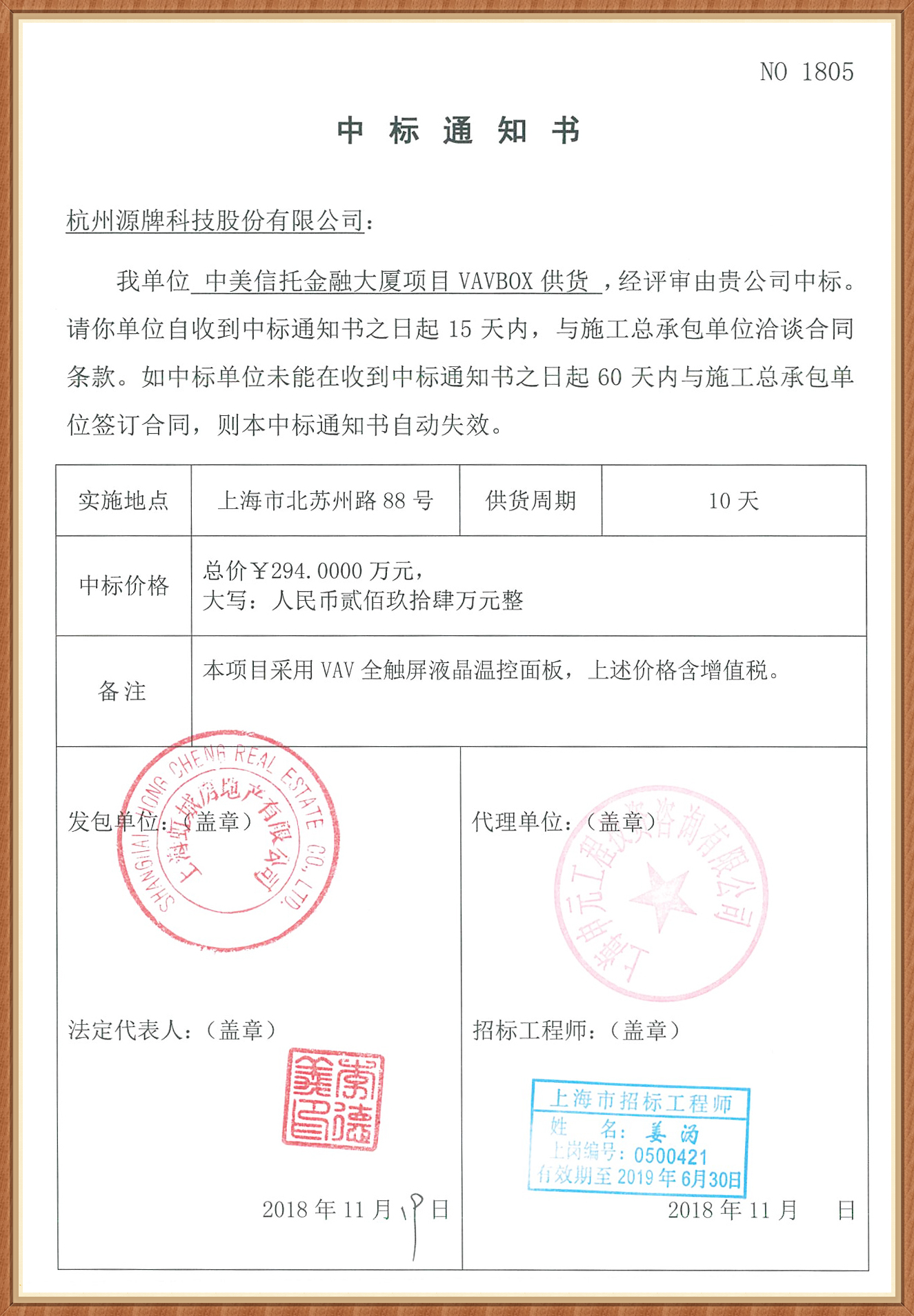 源牌中標(biāo)上海中美信托金融大廈項(xiàng)目